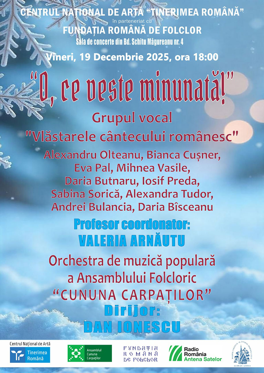 Centrul Național de Artă „Tinerimea Română”, în colaborare cu Fundația Română de Folclor, propune iubitorilor de cântec folcloric românesc, în data de 19.12.2005, ora 18:00, la Palatul Tinerimea Română , un nou concert sub genericul „O, ce veste minunată”,susținut de Grupul folcloric „Vlăstarele cântecului românesc” și de Orchestra de muzică populară a Ansamblului Folcloric “Cununa Carpaților”, dirijată de Dan Ionescu.