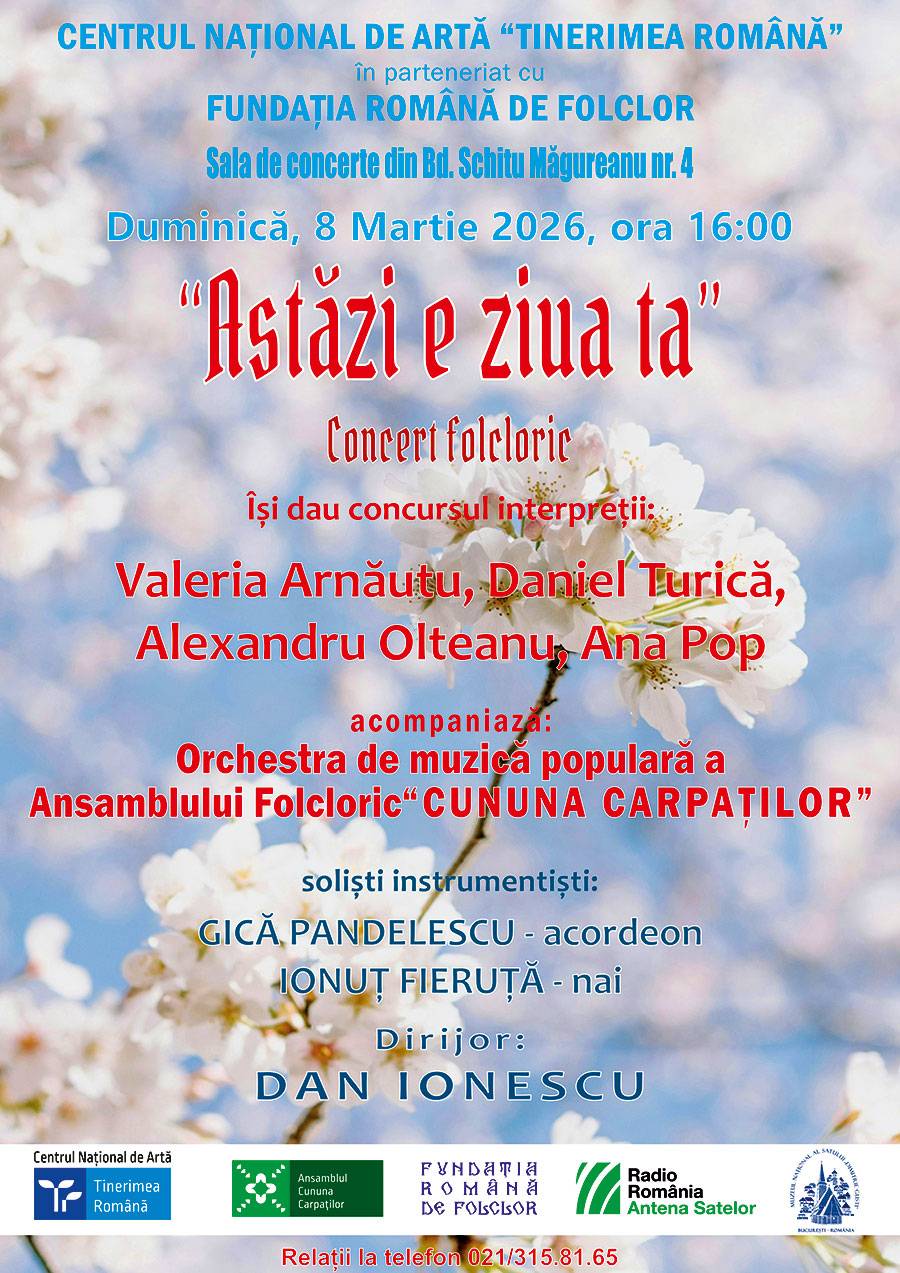 Centrul Național de Artă “Tinerimea Română” invită publicul bucureştean la Palatul Tinerimea Română, duminică, 8 martie 2026, ora 16:00, la un concert folcloric sub genericul „Astăzi e ziua ta!”. Concertul are o semnificație aparte fiind dedicat în exclusivitate celei mai dragi ființe de pe pământ: FEMEIA .