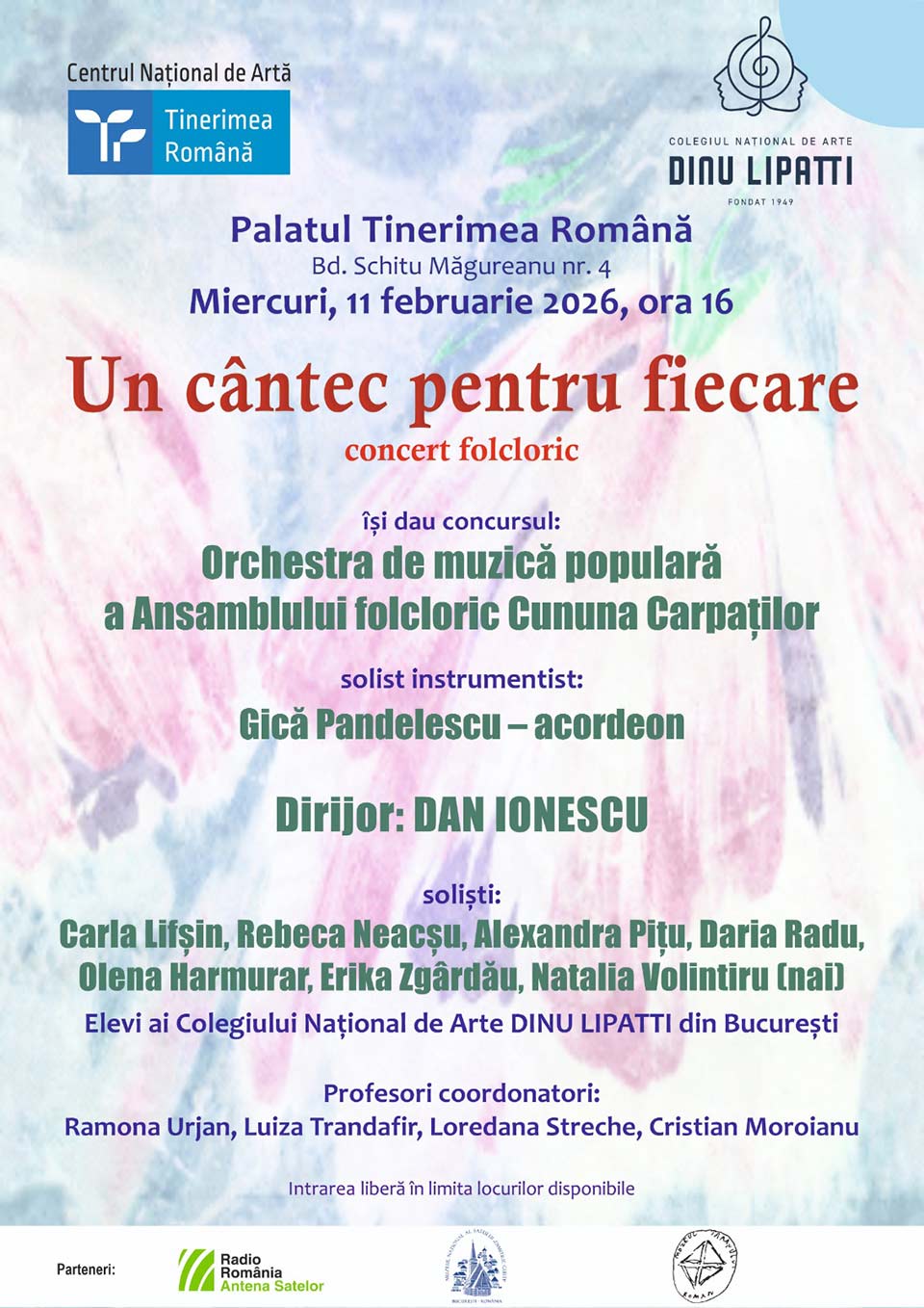 Orchestra de muzică populară a Ansamblului Folcloric “Cununa Carpaților”, dirijată de Dan Ionescu, va susține în data de 11.02. 2026, ora 16:00, la Palatul Tinerimea Română un Concert Folcloric Educativ sub genericul Un cântec pentru fiecare.
